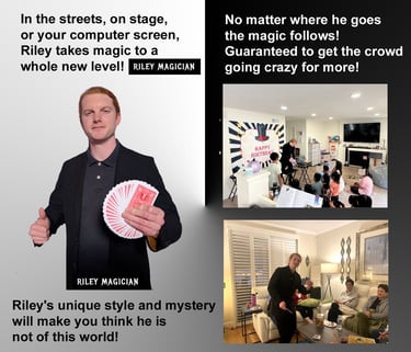 Experience RILEY MAGIC LIVE on your gig or event - Riley will literally bend reality right before your eyes with interactive Magic, Mentalism, Escapes, Illusions & Sleight of Hand.